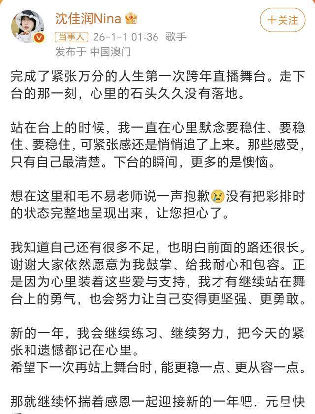 沈佳润本人显然也对自己的表现不满意,很快发了长文说,没有发挥出彩排时的实力和对毛不易的歉意。